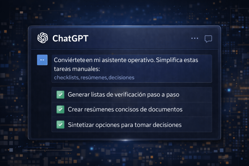 Usarlo para pensar procesos, no solo para escribir textos pedirle que simplifique tareas manuales convertirlo en asistente operativo (checklists, resúmenes, decisiones).